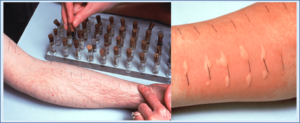 Εικ.6 Αλλεργικό ή αδενοειδές προσωπείο[/caption] Μετά την κλινική εξέταση και τον καθορισμό της διάγνωσης, ο ειδικός αλλεργιολόγος θα εκτελέσει τις δερματικές δοκιμασίες νυγμού (skin prick tests) ή αλλεργικά tests, (εικόνα 7) μια διαδικασία που απαιτεί 15-20 λεπτά της ώρας και δίνει άμεσα αποτέλεσμα για το ένοχο αλλεργιογόνο στο οποίο είναι ευαίσθητος ο ασθενής. Ακολουθούν ειδικές αιματολογικές εξετάσεις με μέτρηση της ολικής ανοσοσφαιρίνης E και των ειδικών ανοσοσφαιρινών Ε (RAST) για συγκεκριμένα αλλεργιογόνα. Ο ακτινολογικός έλεγχος των παραρρινίων γίνεται για να αποκλειστεί η ύπαρξη παραρρινοκολπίτιδας. Τέλος, σε συγκεκριμένες περιπτώσεις με συμβατό ιστορικό και αρνητικό έλεγχο, διενεργείται ρινική δοκιμασία πρόκλησης με το ύποπτο αλλεργιογόνο. Ο έλεγχος είναι πολύ σημαντικός, καθώς ο εντοπισμός του υπευθύνου αλλεργιογόνου είναι απαραίτητος ώστε να δοθούν οι κατάλληλες οδηγίες αποφυγής όπου είναι δυνατό, αλλά και να οριστεί η διάρκεια της θεραπείας.Ένας ακόμα πολύ σημαντικός λόγος είναι η ταυτοποίηση των αλλεργιογόνων στα οποία υπάρχει ευαισθησία ώστε να μπορεί να γίνει θεραπεία απευαισθητοποίησης ή ανοσοθεραπεία, που θα αναφερθεί παρακάτω. [caption id="attachment_2171" align="alignleft" width="300"]